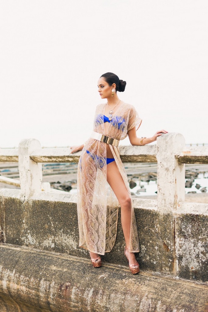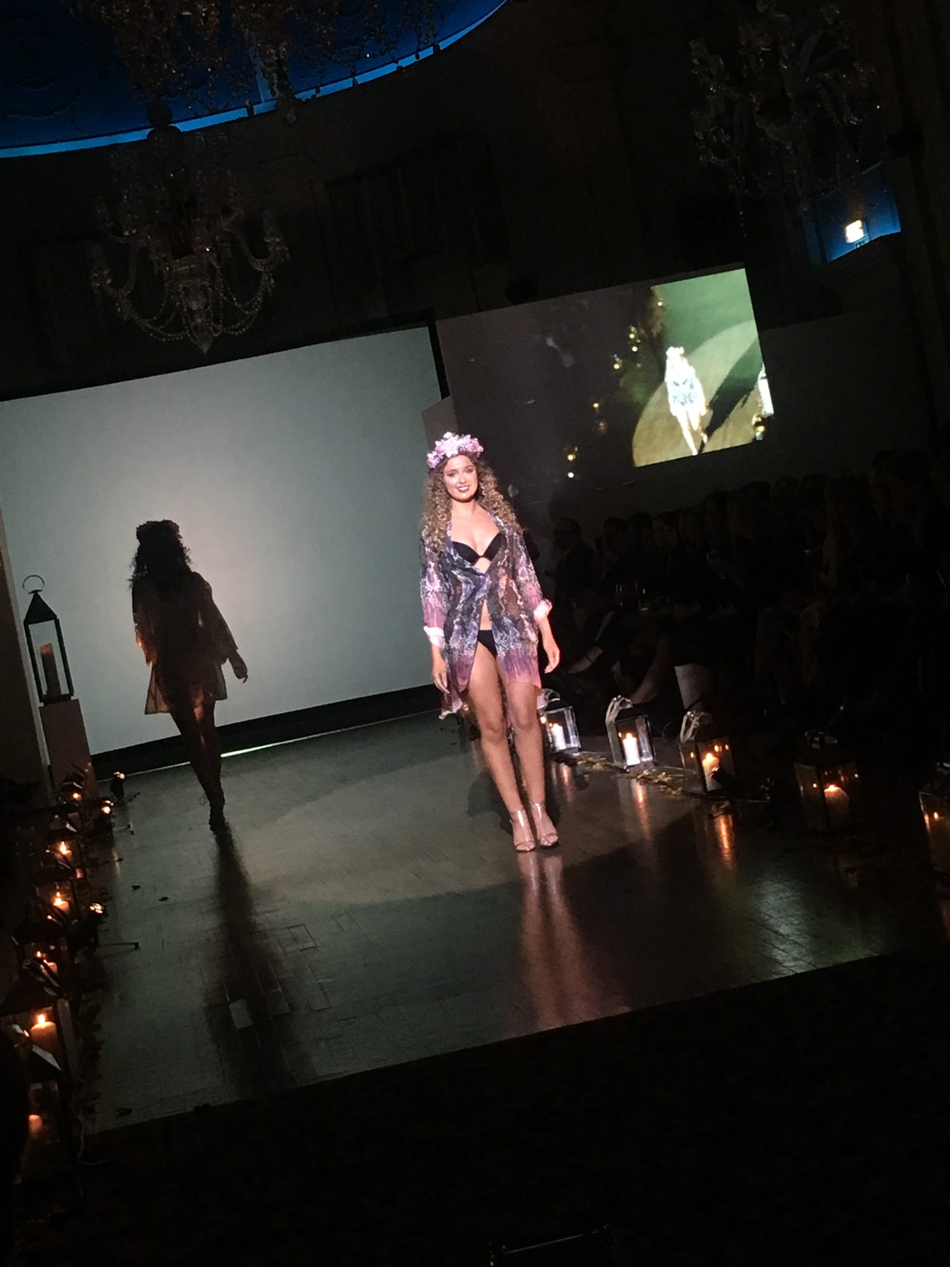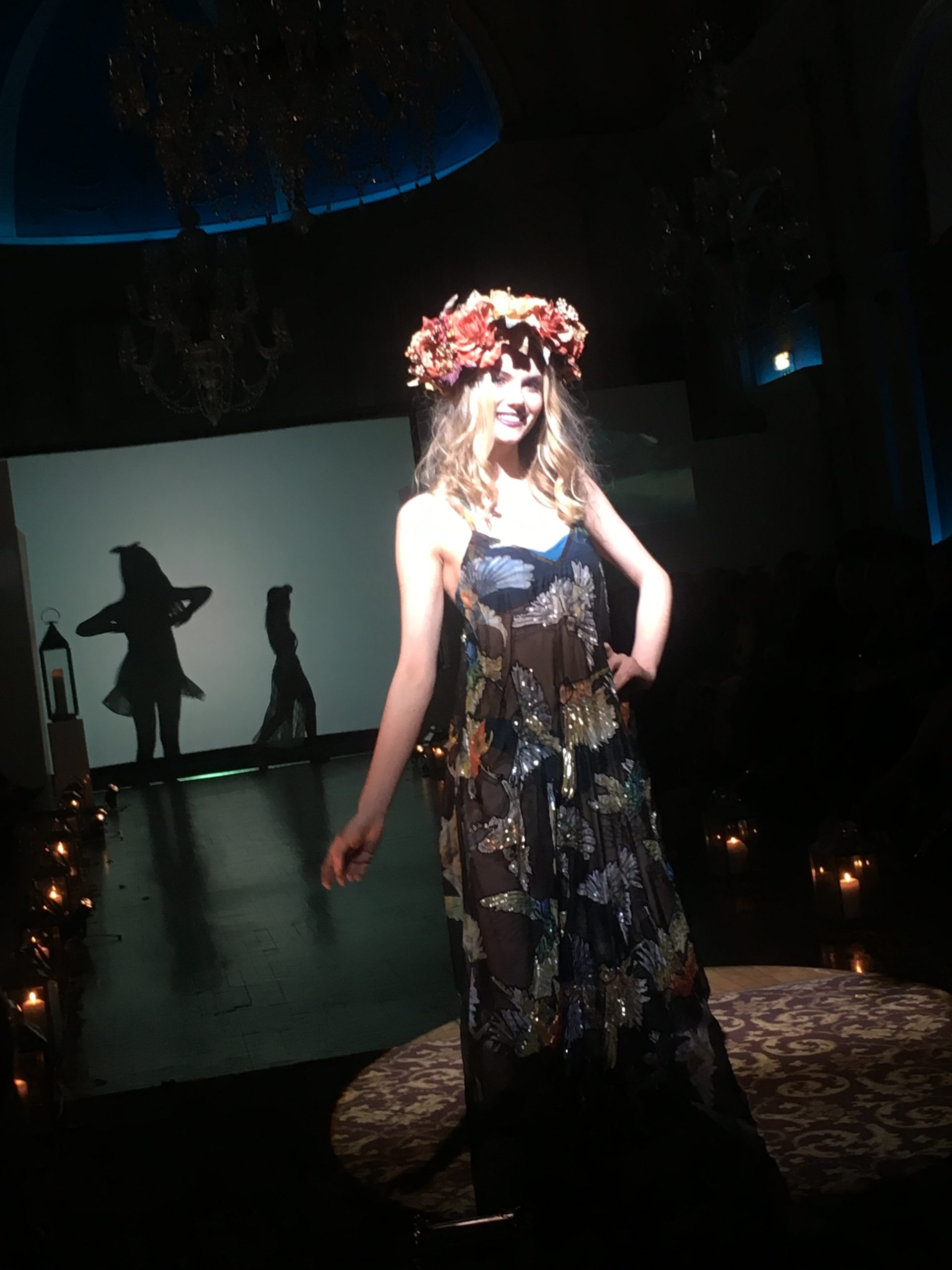 First up, resort wear. A pretty awesome collection of cool kaftans, cover ups and swimwear. From racy fishnet throw on dresses, to soft, floaty full length waistcoats, the collection didn’t disappoint and was a lot more fresh and urban than Nisha’s usual classic offering. With the darker theme this season and topped with flower crowns, models looked like they’d strode straight off a Lana Del Rey video shoot.