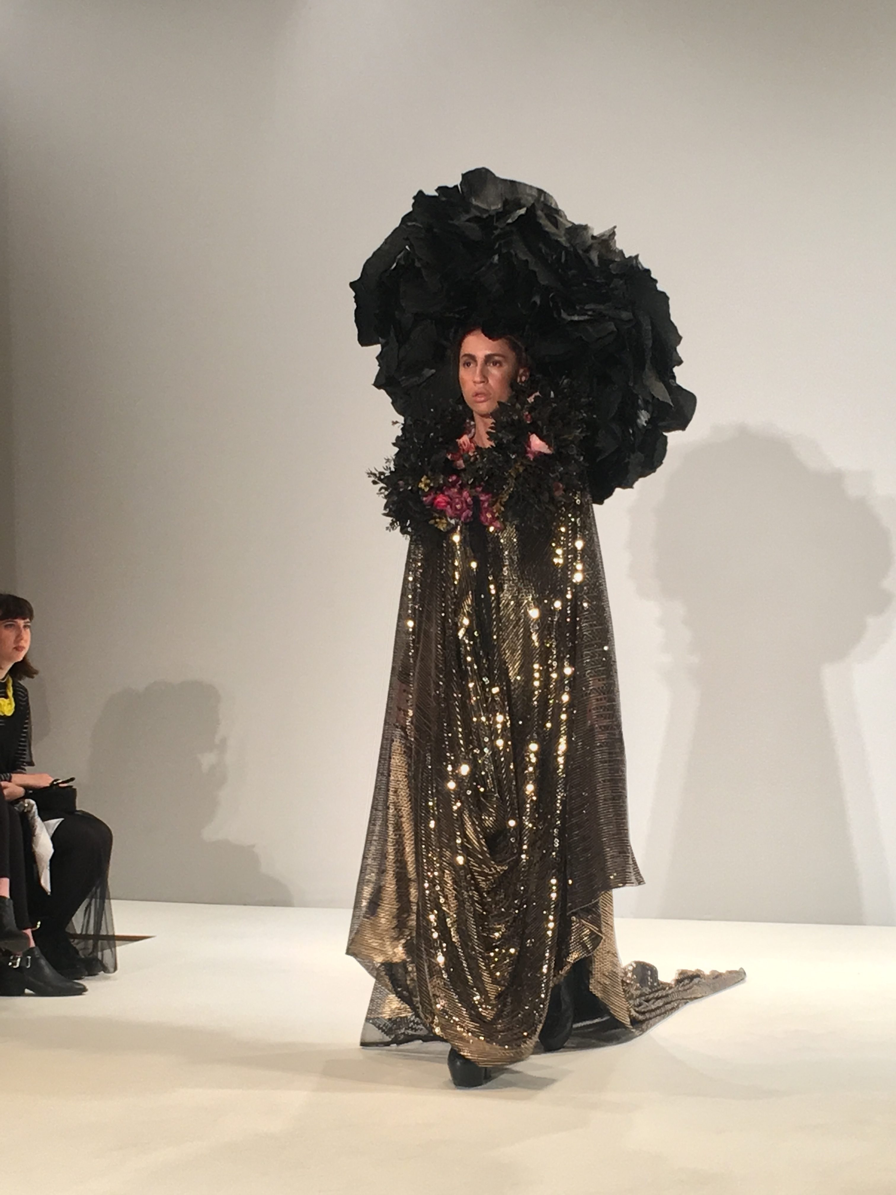 The opening look set the tone for the show, a shimmering oversized gown masked the model’s limbs giving the illusion of exaggerated height, topped off with a ginormous flower crown beyond even your wildest dreams, fashioned out of paper by specialist crafters, Tissue Blossoms.