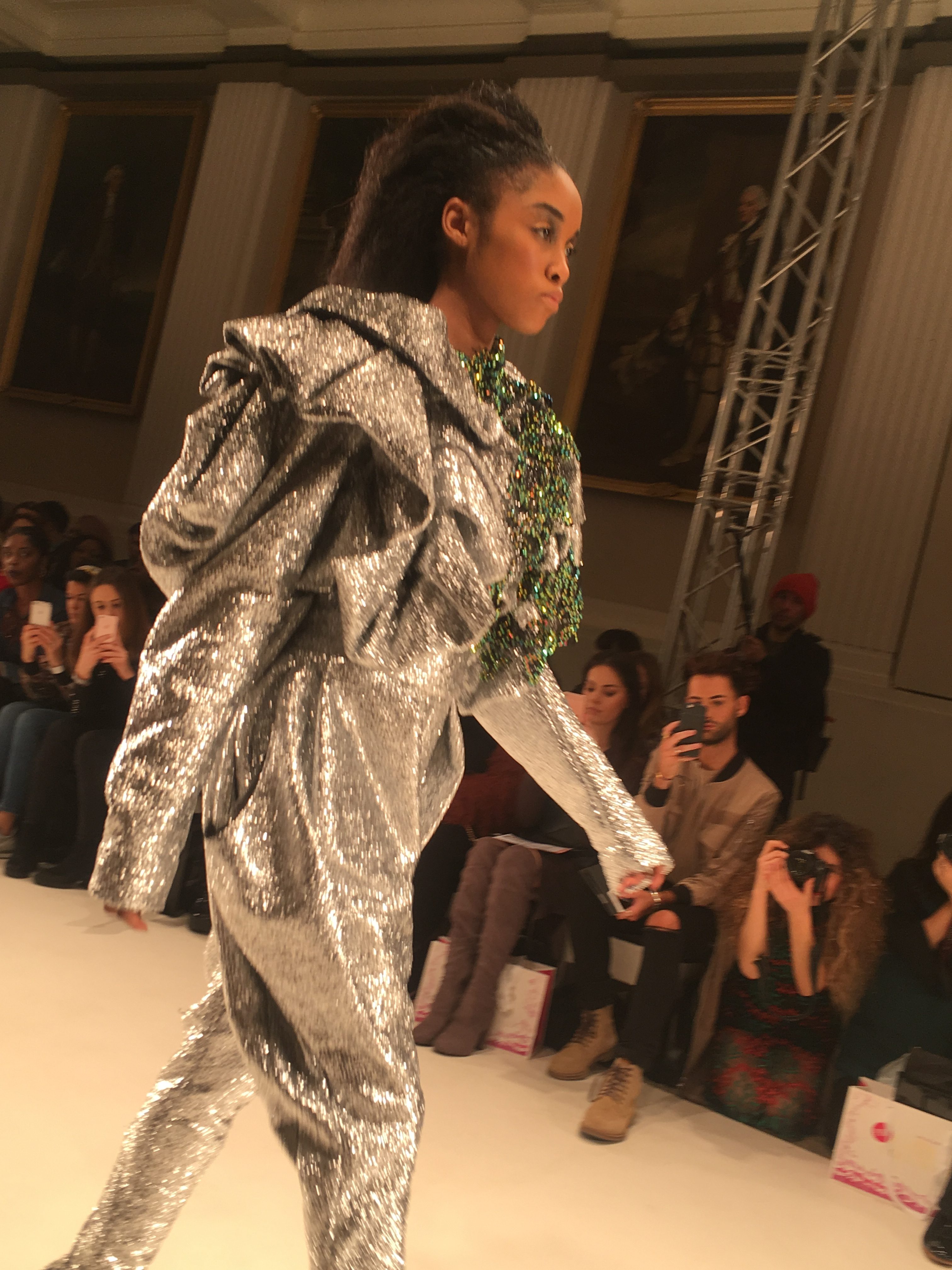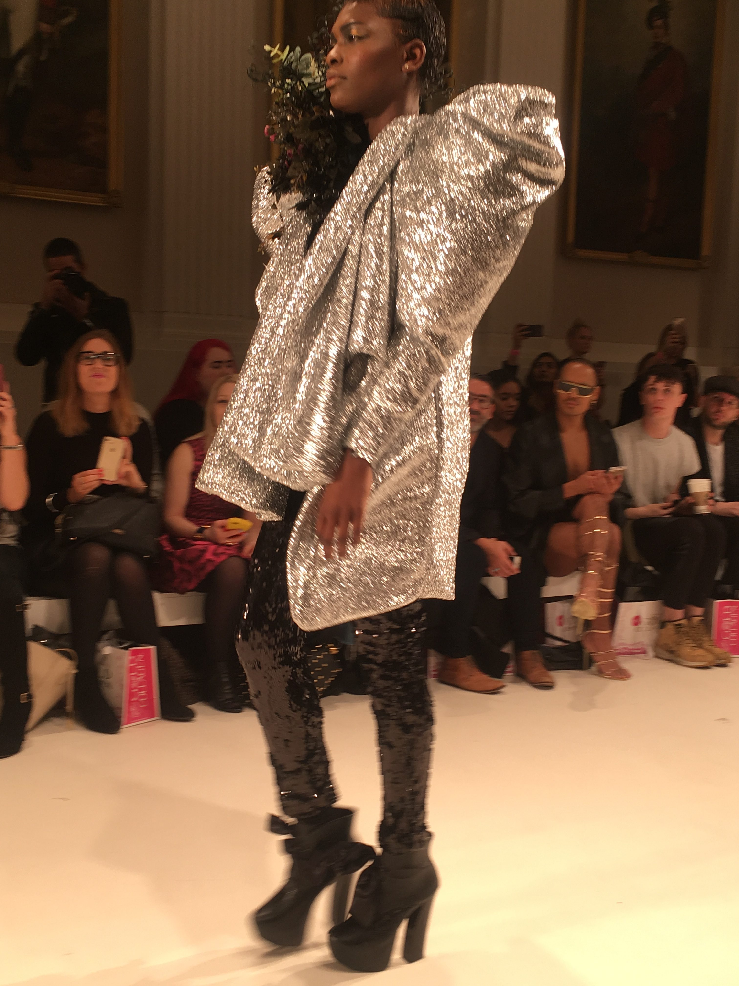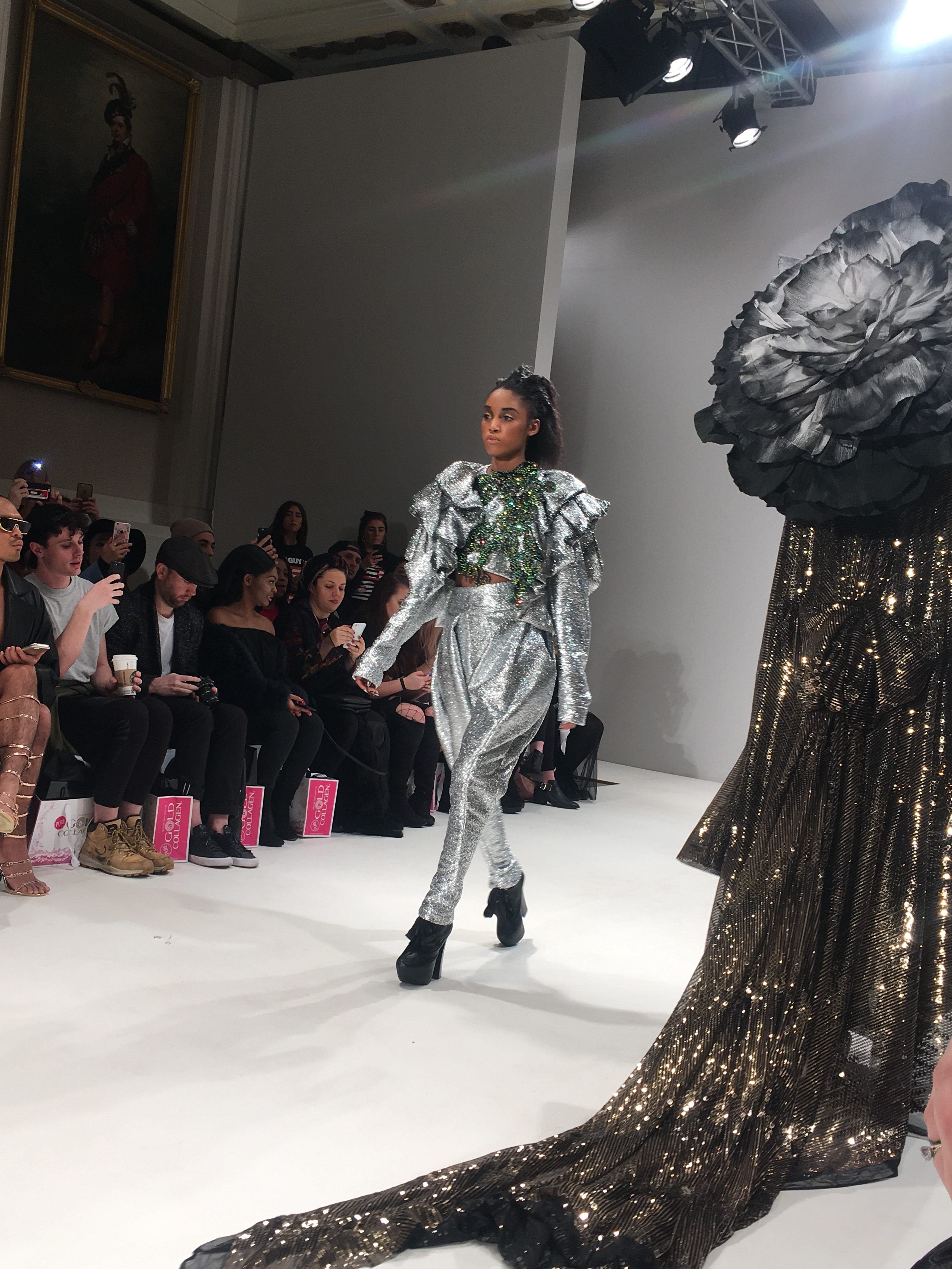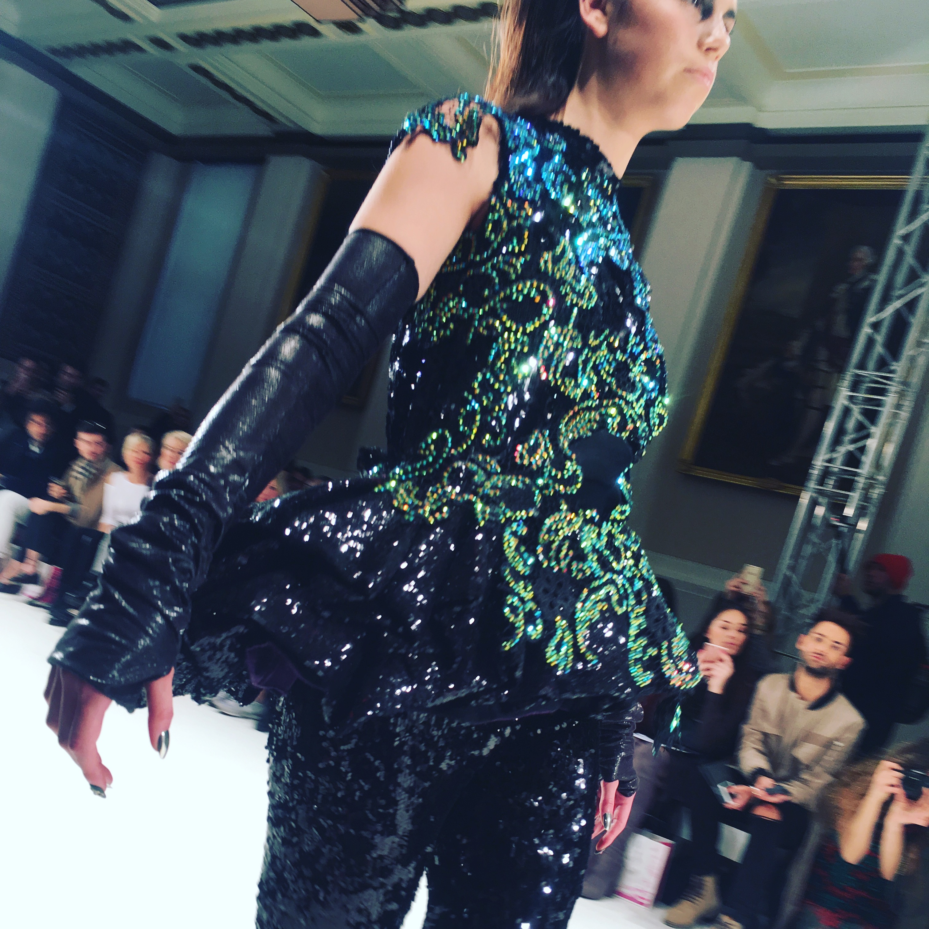 A silver two piece consisting of harem pants and a metallic, frilled top dripping with emerald coloured stones (one of my favourite looks) gave off a space age mermaid vibe as an awesome follow up to the opener. From the Frow, in the VIP section no less, I had a fantastic view of this exciting showcase, a collection which tests boundaries and challenges proportions. A glittertastic, brocade wrapped, flower topped collection of couture for confident, powerful women who don’t fall at the feet of men.
