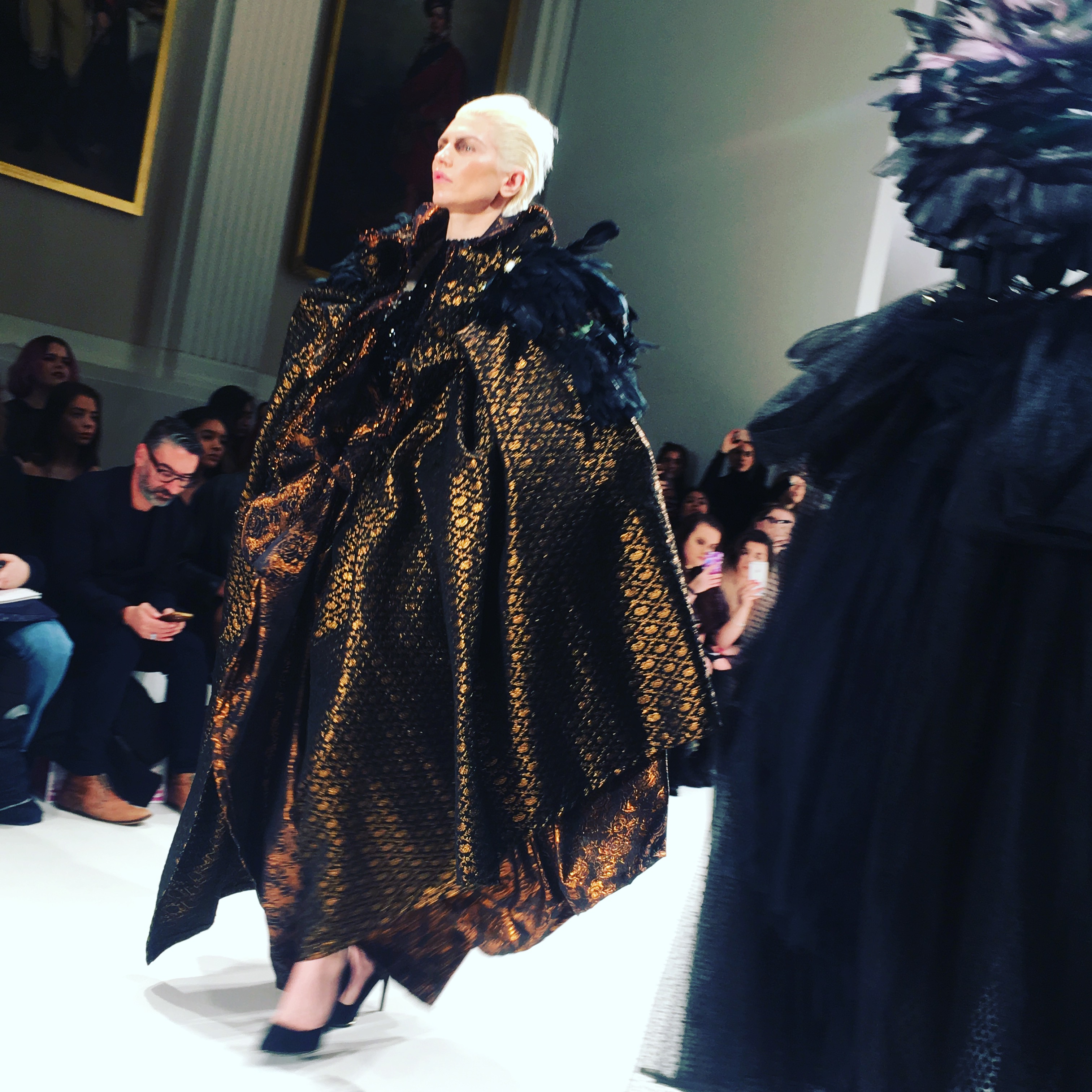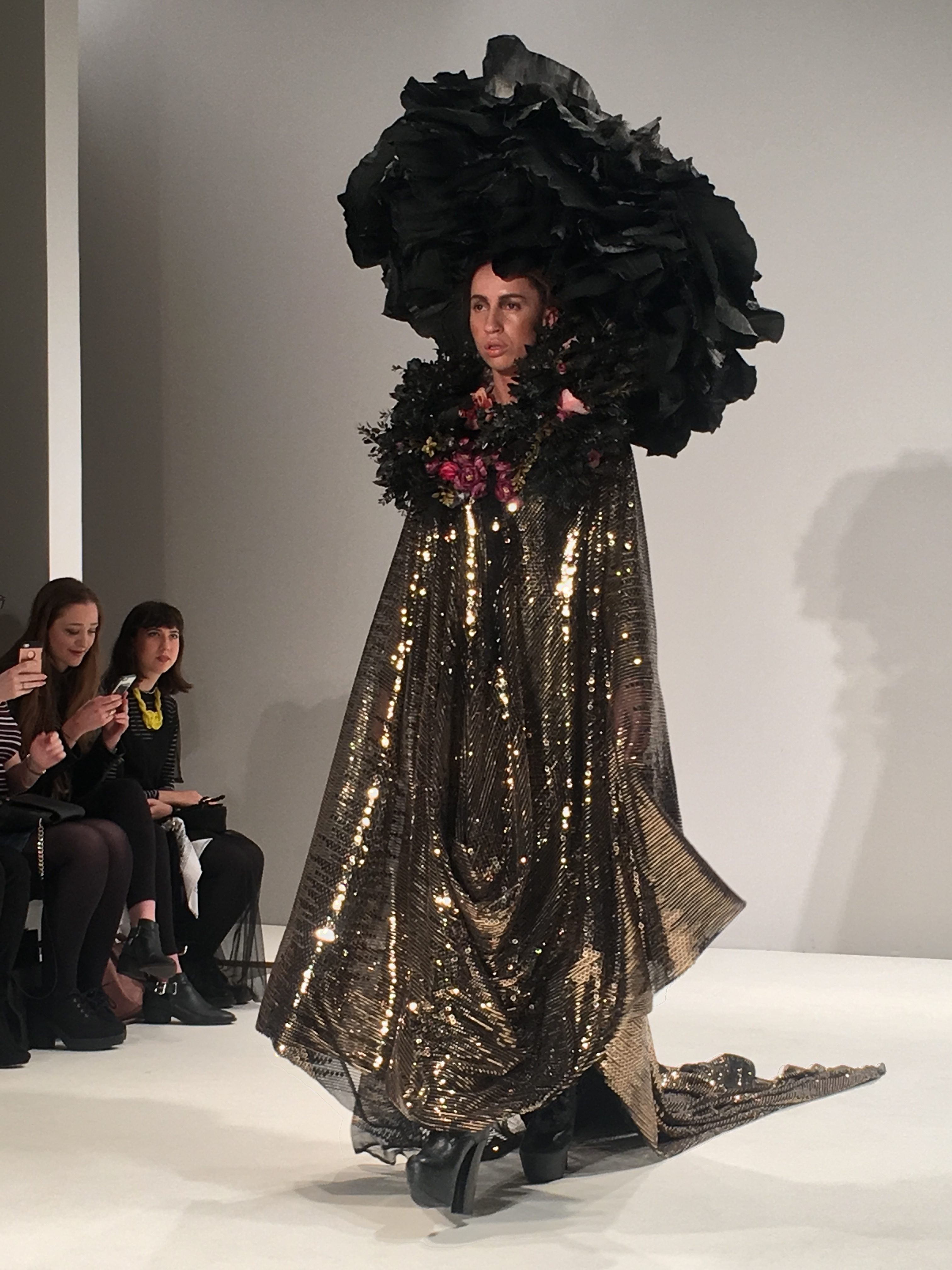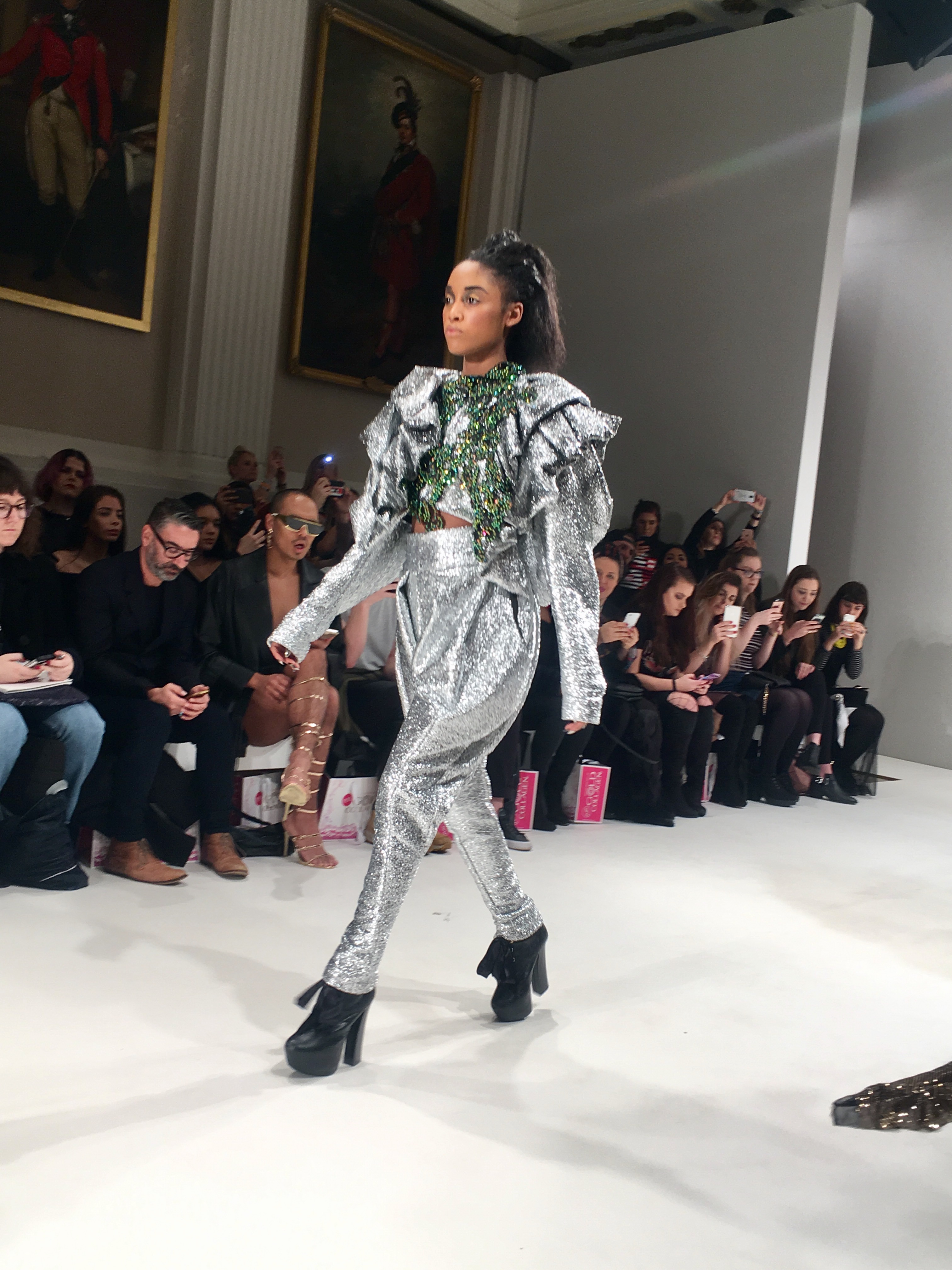 A silver two piece consisting of harem pants and a metallic, frilled top dripping with emerald coloured stones (one of my favourite looks) gave off a space age mermaid vibe as an awesome follow up to the opener. From the Frow, in the VIP section no less, I had a fantastic view of this exciting showcase, a collection which tests boundaries and challenges proportions. A glittertastic, brocade wrapped, flower topped collection of couture for confident, powerful women who don’t fall at the feet of men.