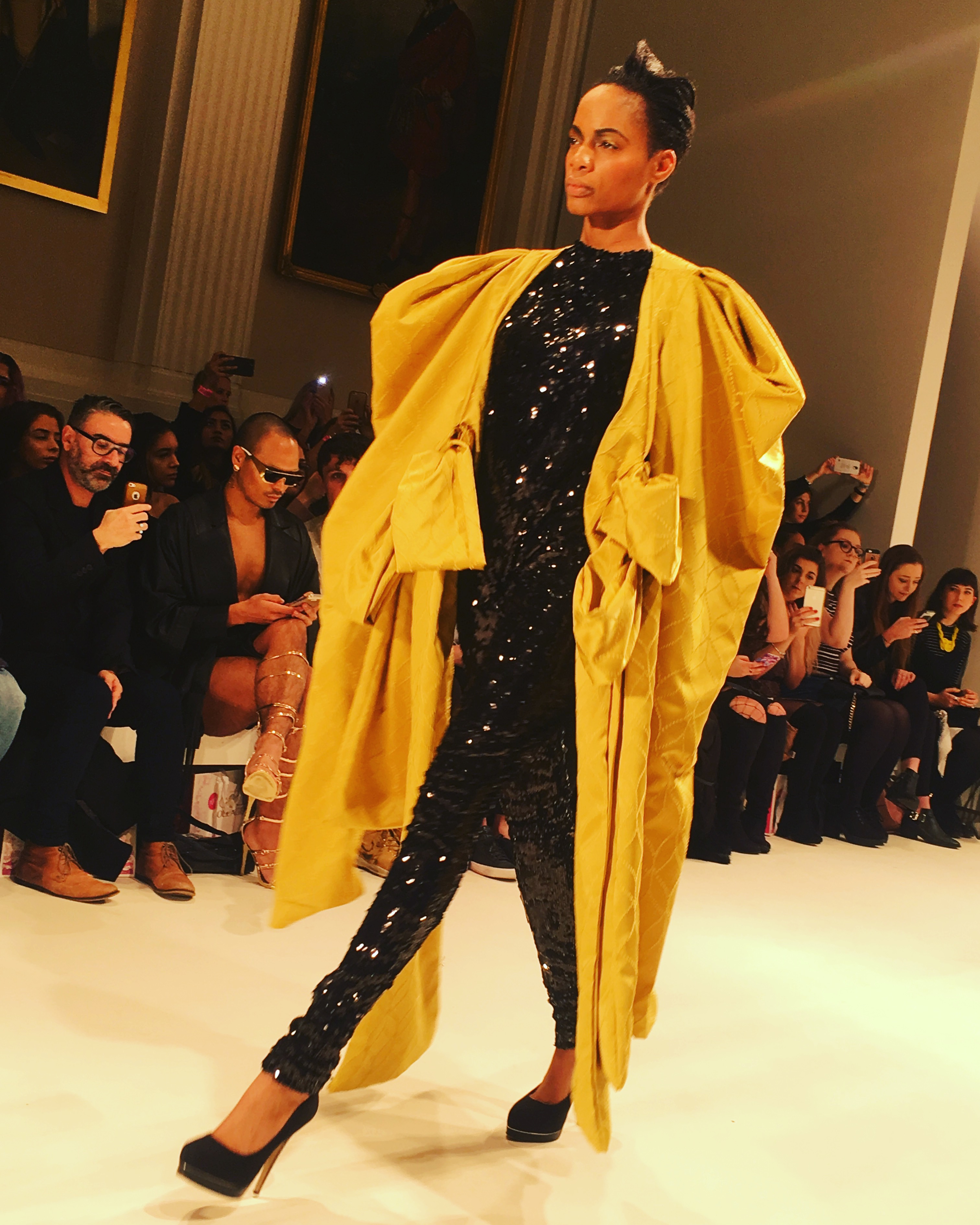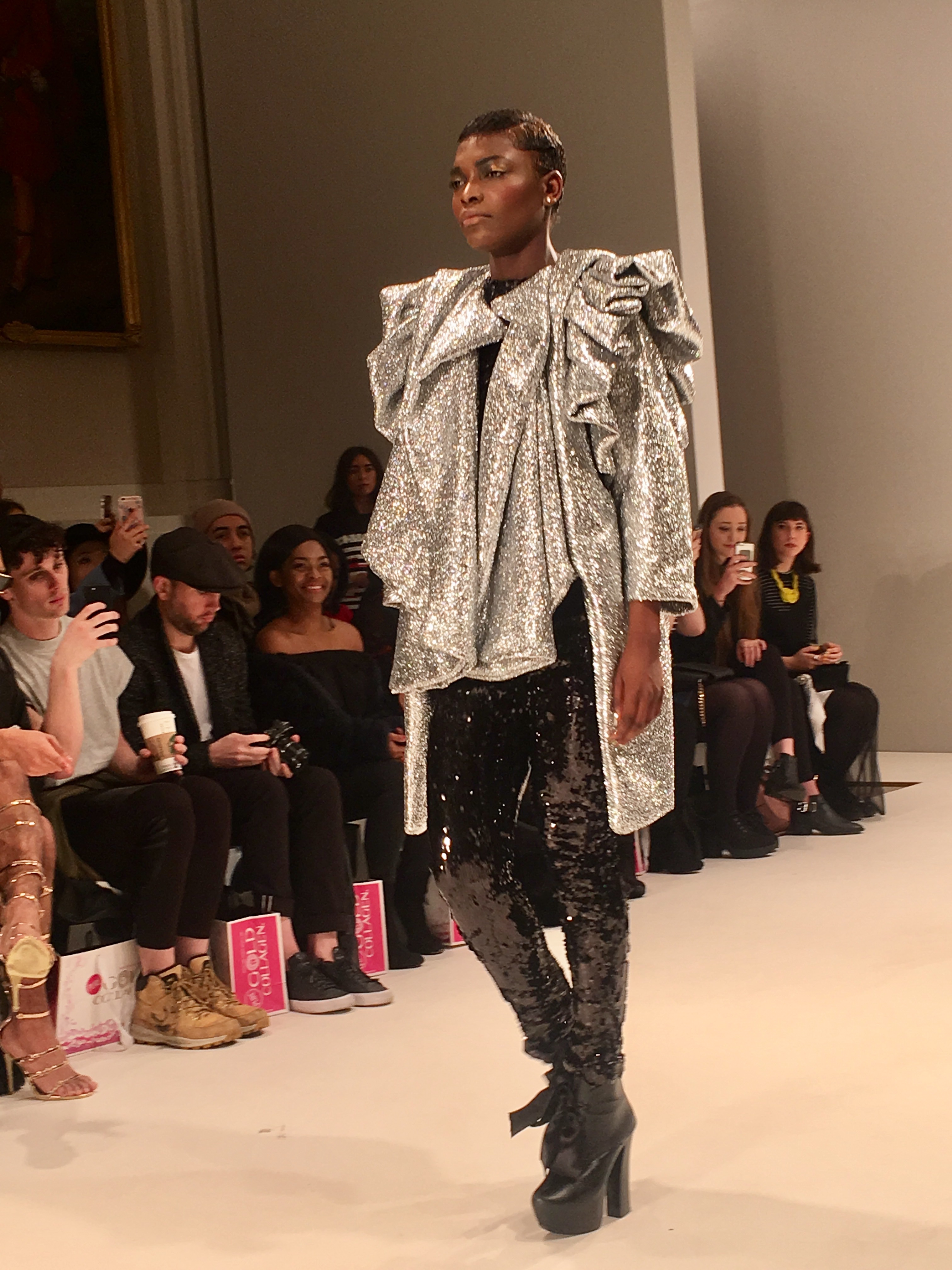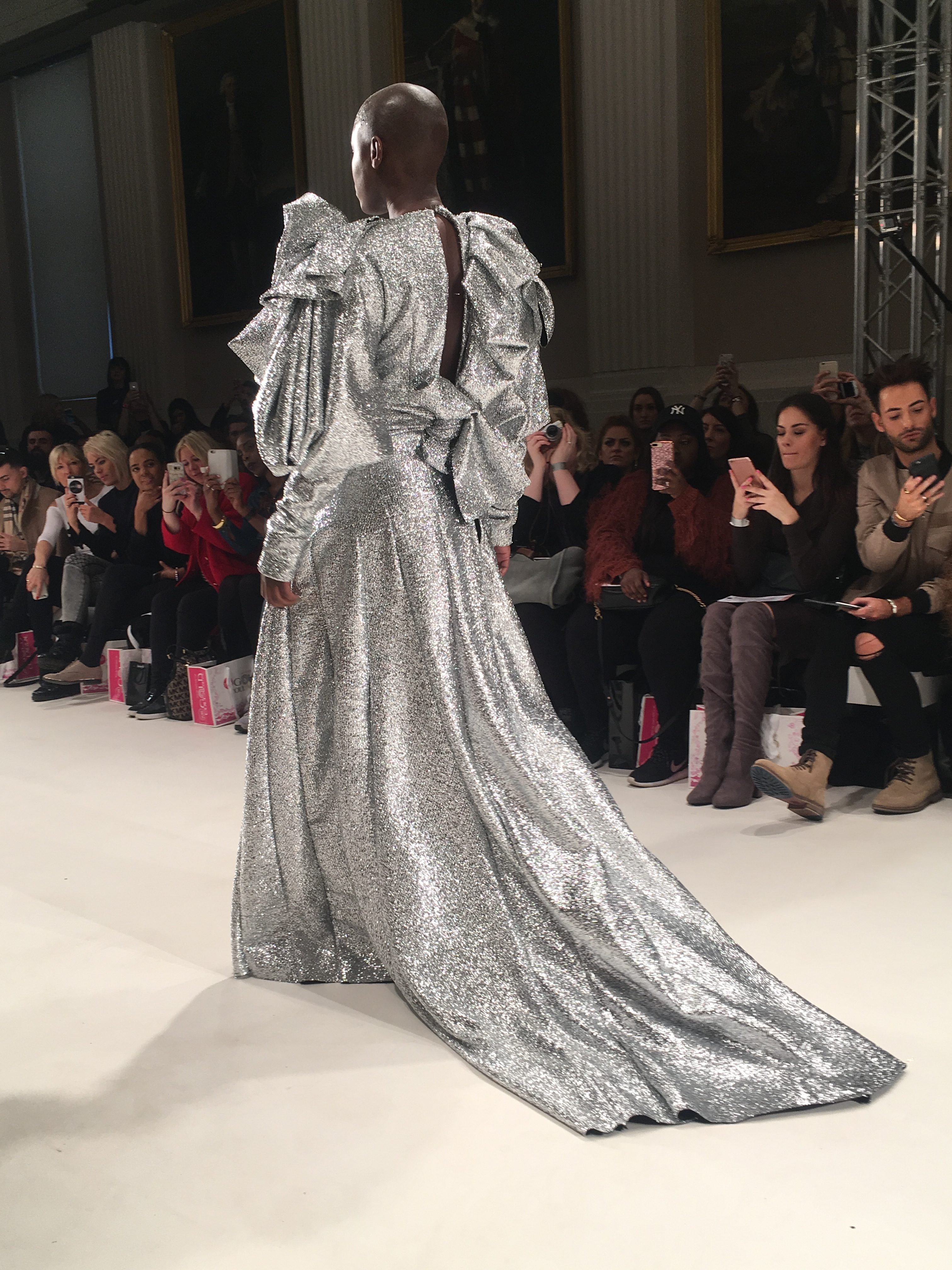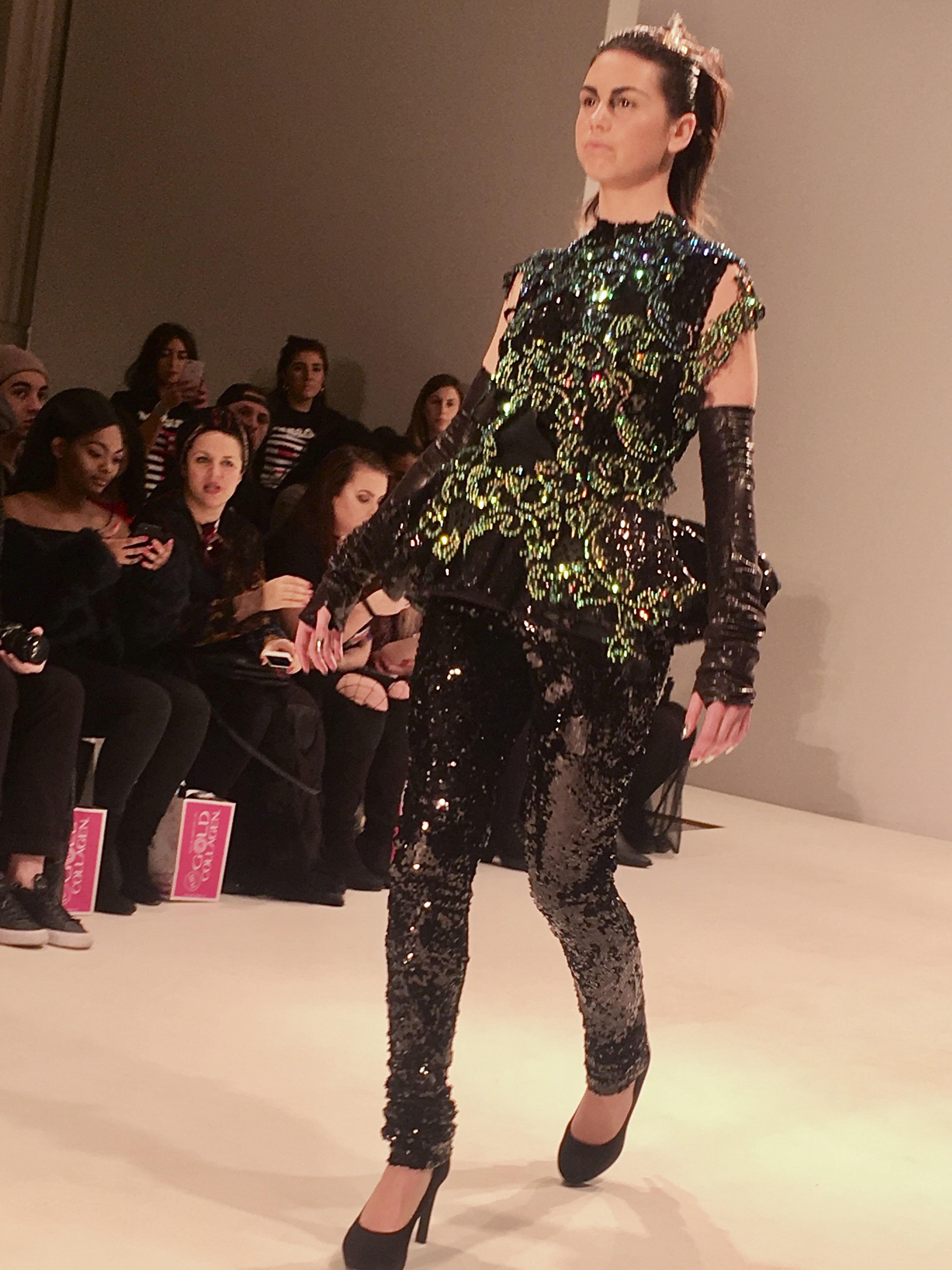 A silver two piece consisting of harem pants and a metallic, frilled top dripping with emerald coloured stones (one of my favourite looks) gave off a space age mermaid vibe as an awesome follow up to the opener. From the Frow, in the VIP section no less, I had a fantastic view of this exciting showcase, a collection which tests boundaries and challenges proportions. A glittertastic, brocade wrapped, flower topped collection of couture for confident, powerful women who don’t fall at the feet of men.
