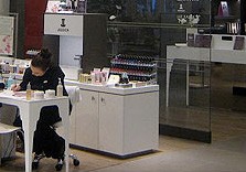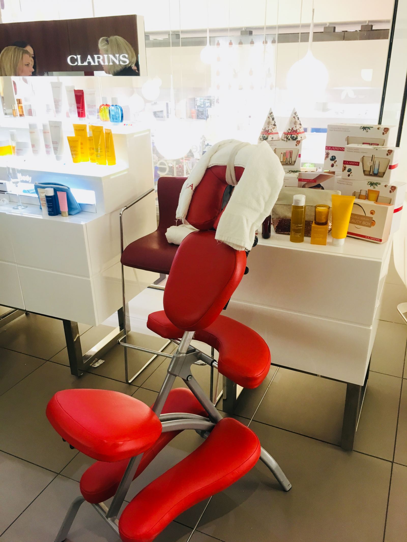 Clarins monopolises the upstairs space with a large counter and treatment spa which looks out over the store through smoked glass. Therapists were on hand to give pressure point massages in those weird massage chairs that you can never quite get comfortable in. The space upstairs is clinical, contemporary and quiet, despite being right in front of the busy department store. With several treatment rooms at their disposal, the Clarins team have a suite of face and body treatments available to book as solo treatments or as a discounted block.