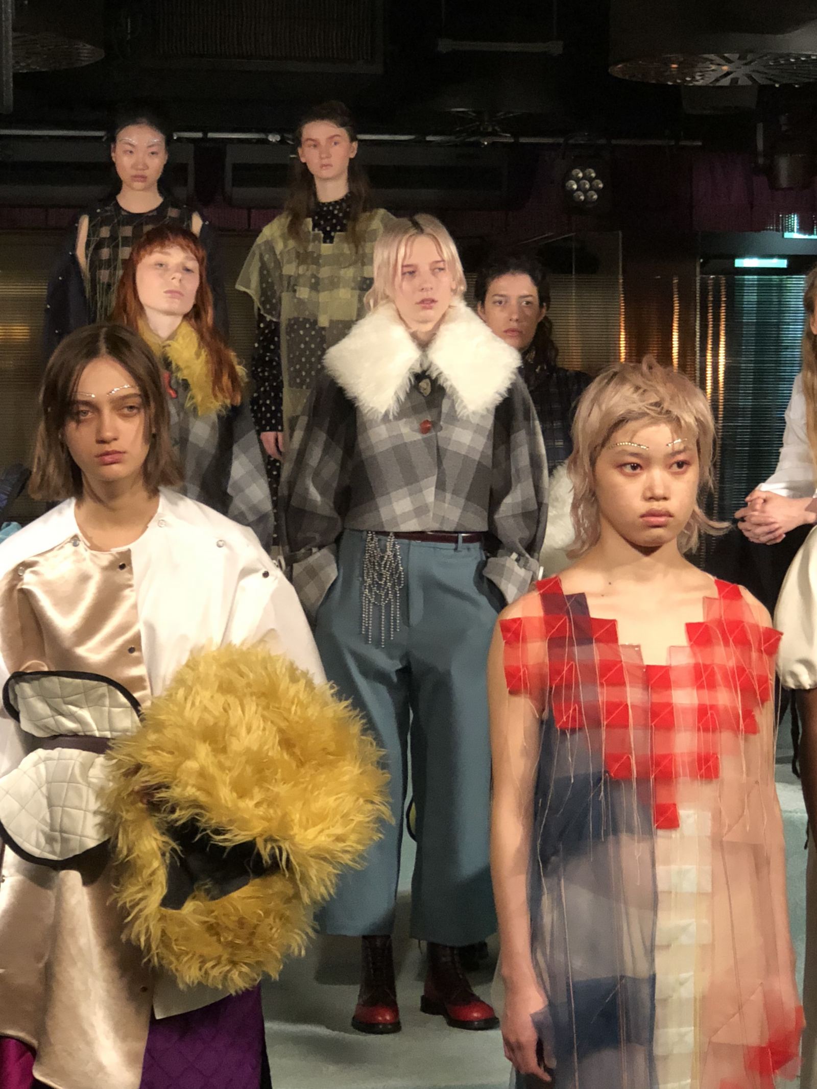 Taffeta jackets are part quilted to resemble the reflections that can be seen in precious gem stones and it’s these rocks, minerals and gemstones that form the very foundations of Minki’s designs past and present. Raw and fragile details such as stone snap buttons from Morocco are paired with heavier materials and shiny velvet trimmings, transparent PVC and furry mohair to create a juxtaposition of texture that works undeniably well throughout the collection. The check / pleat combo is a personal favourite of mine and the masculine styling of the most feminine pieces is so current it hurts. Kudos Minki, the FW18 presentation provided a well planned, thought provoking collection that seeks to explore the question: Who has been the most sophisticated creator, nature or man?