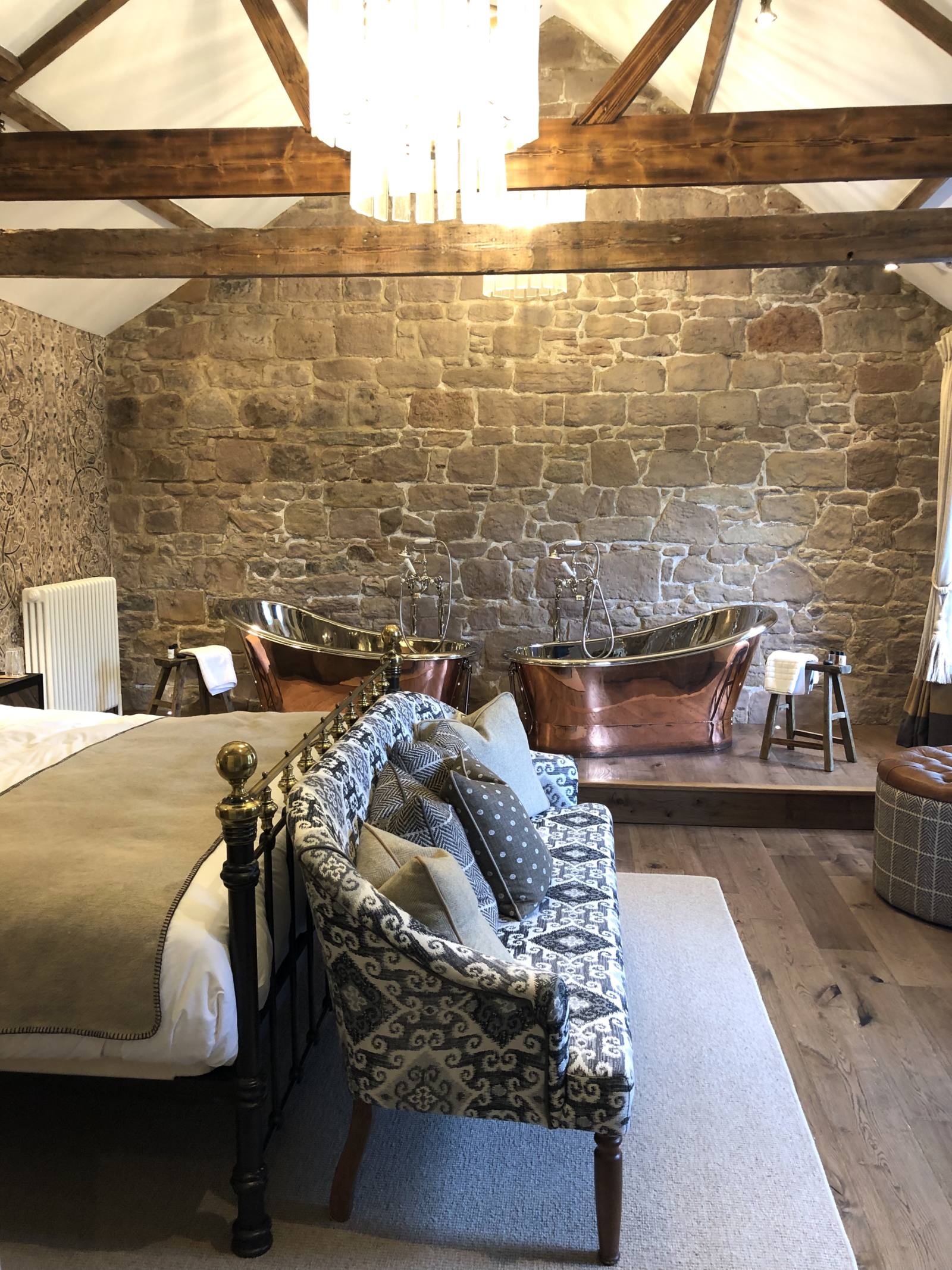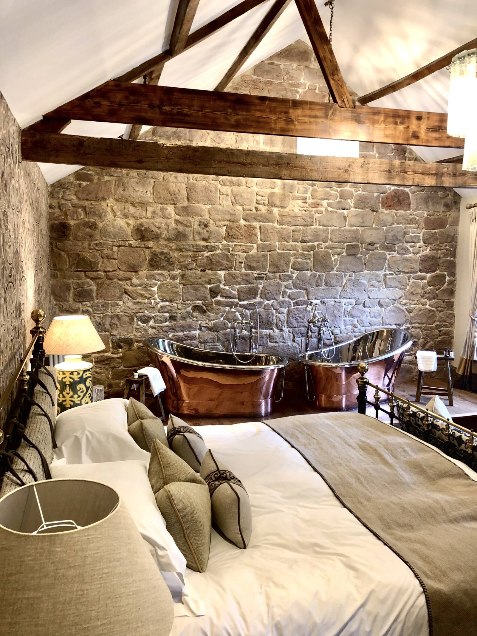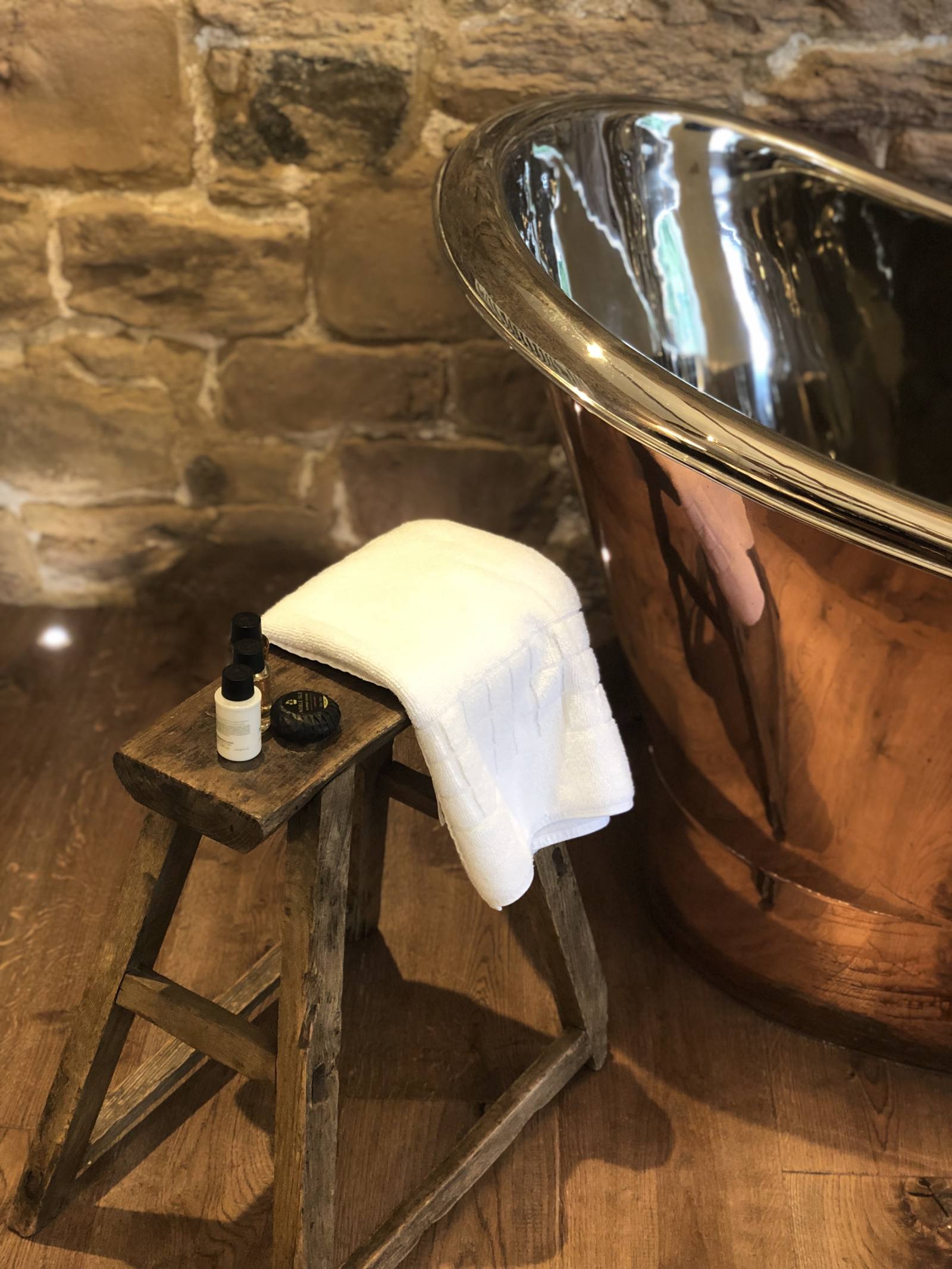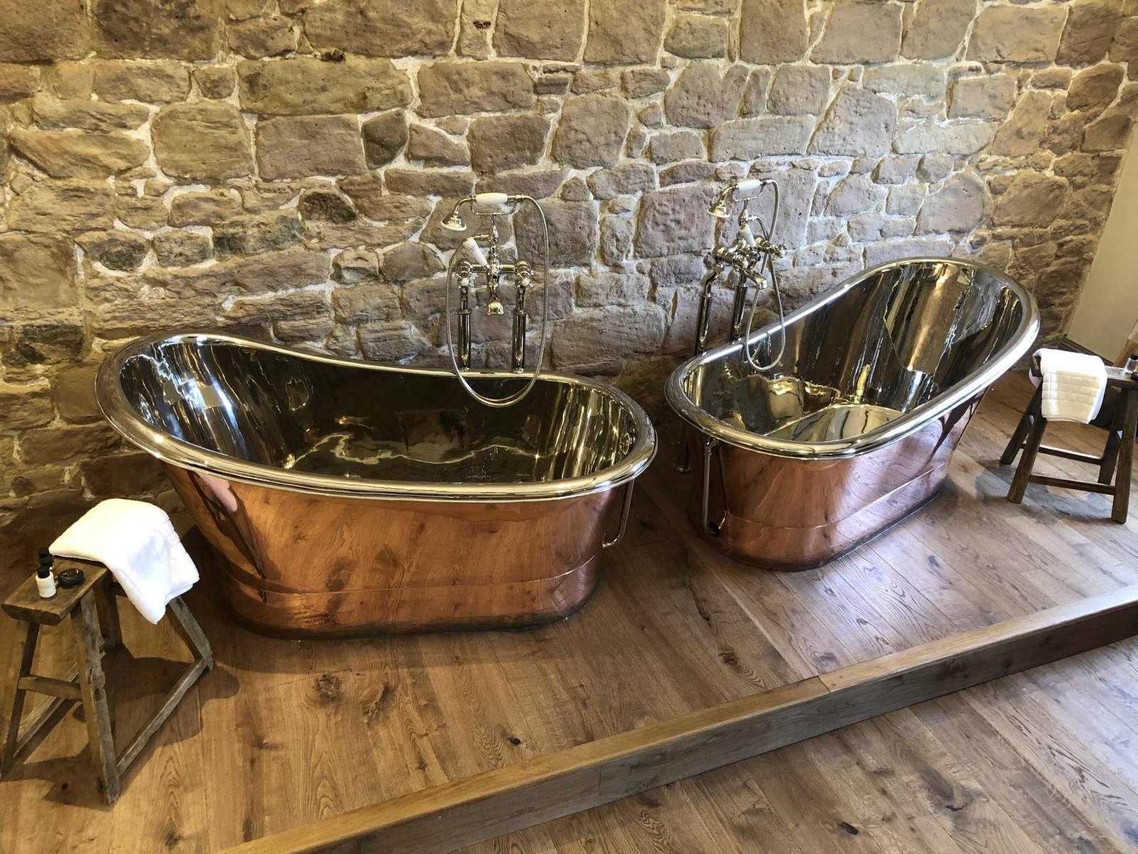 After a short walk up a huge open staircase with the original stone wall and some beautiful feature lighting, we’re shown to Muckle Hoose. A suite like no other. This double room packs a punch and a pinch me moment as the door opens to reveal its twin copper bathtubs sitting atop a backlit plinth behind the bed. The room has everything you expect from a luxury boutique hotel – and more. There are tea and coffee making facilities in each room along with locally sourced shortbread biscuits (the hotel are happy to provide more if you ask), an iron and ironing board if you fancy taking a load up with you, and a wardrobe for stowing luggage.