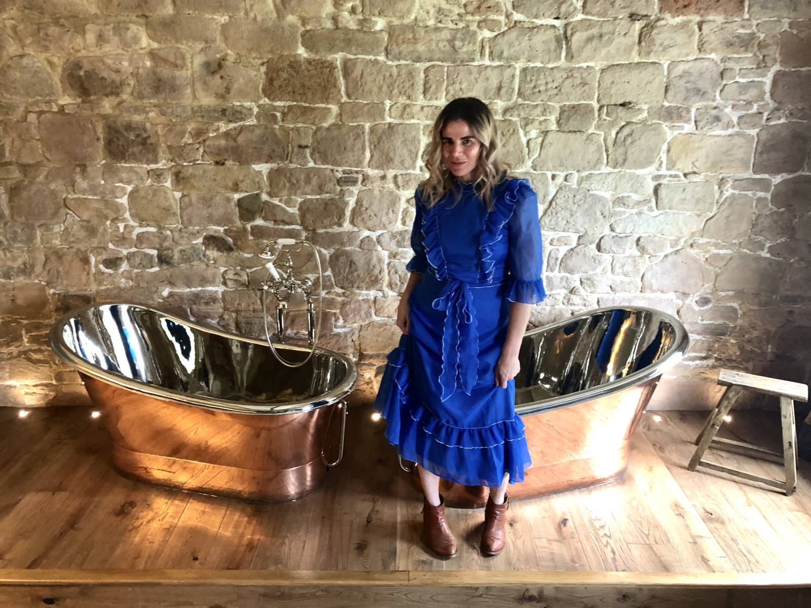 For dinner I put together a really easy outfit, I say it every time and I’ll say it again: a dress is easy because it’s one piece. Easy to pack, easy to dress and easy to accessorise. This particular one is a vintage midi prairie dress in cerulean blue with white trim and I’ve paired it with my favourite battered old cowboy boots from Topshop.