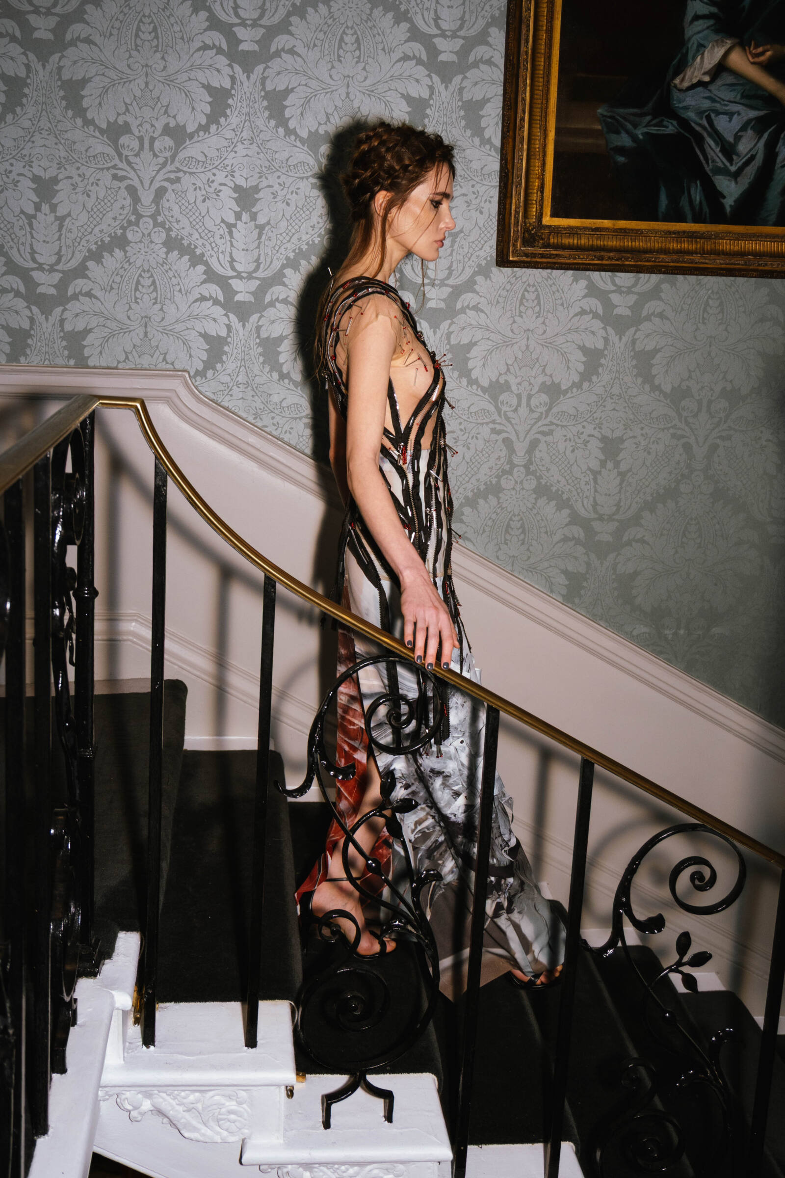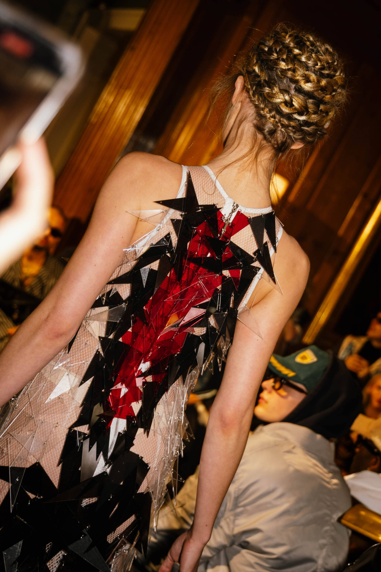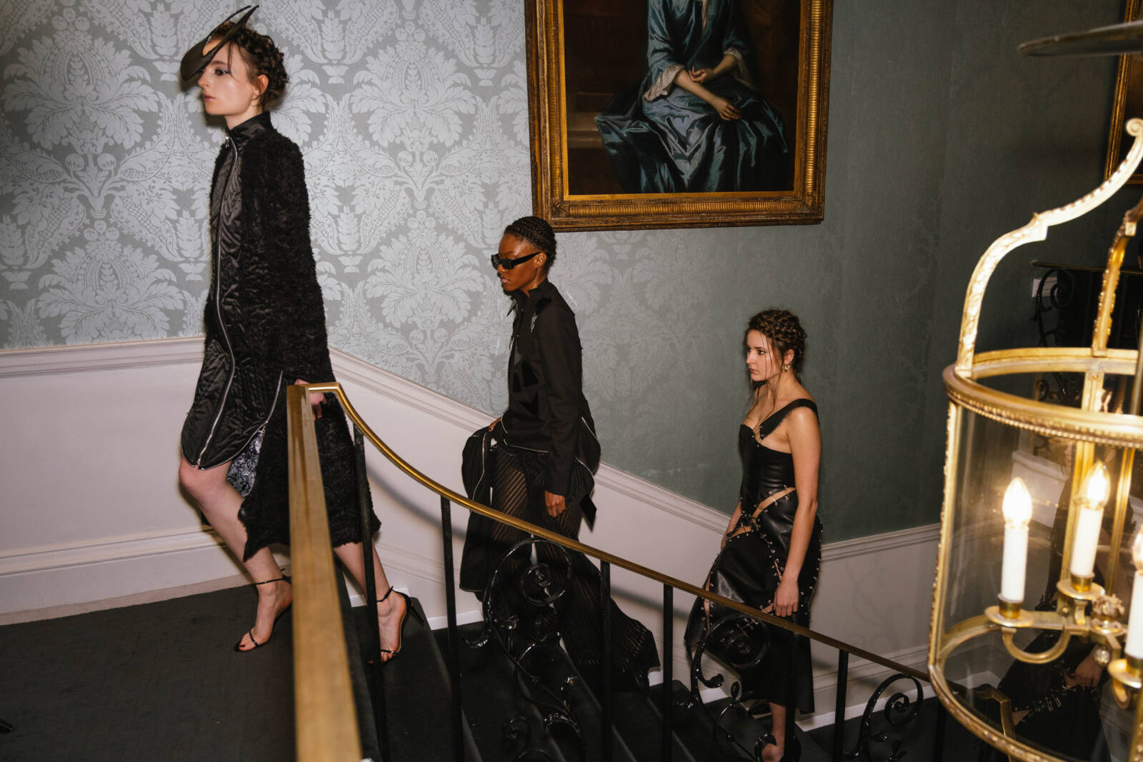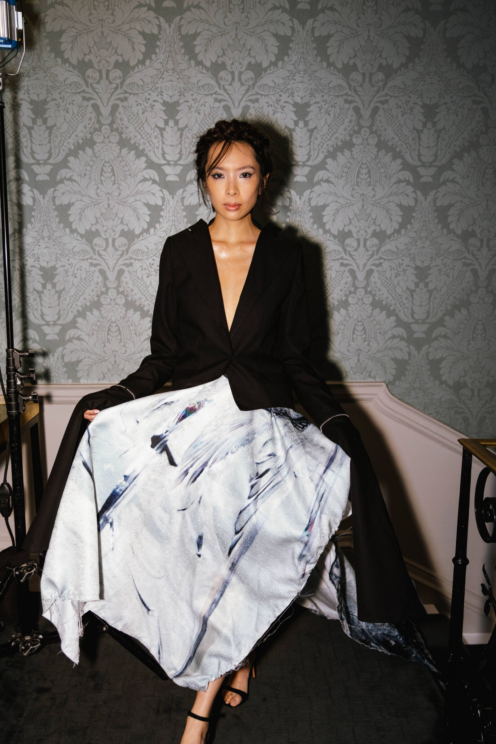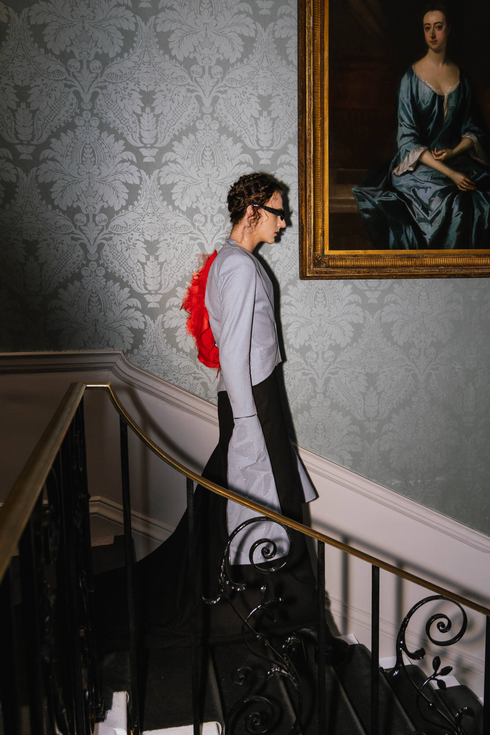 The collection consists of 26 predominantly womenswear looks, with selected menswear silhouettes, exploring the act of rebuilding from what has been broken. Exaggerated tailoring introduces architectural silhouettes, while deconstructed garments are reassembled with intention and technical precision. Sleeves extend dramatically, proportions elongate, and jackets reveal bursts of fabric that emerge like wounds giving these pieces an emotional element as well as structural definition. The palette is stark and evocative: deep blacks, slategreys, luminous silvers, and sharp accents of red that split through the entire collection. Materials are central to the narrative. Printed silks, mohair and denim are combined with innovative textiles developed in collaboration with biomaterial partners including Ponda (ocean sourced nylon), Savian by BioFluff (plant based bio-fur) and Banofi (plant based leather).
