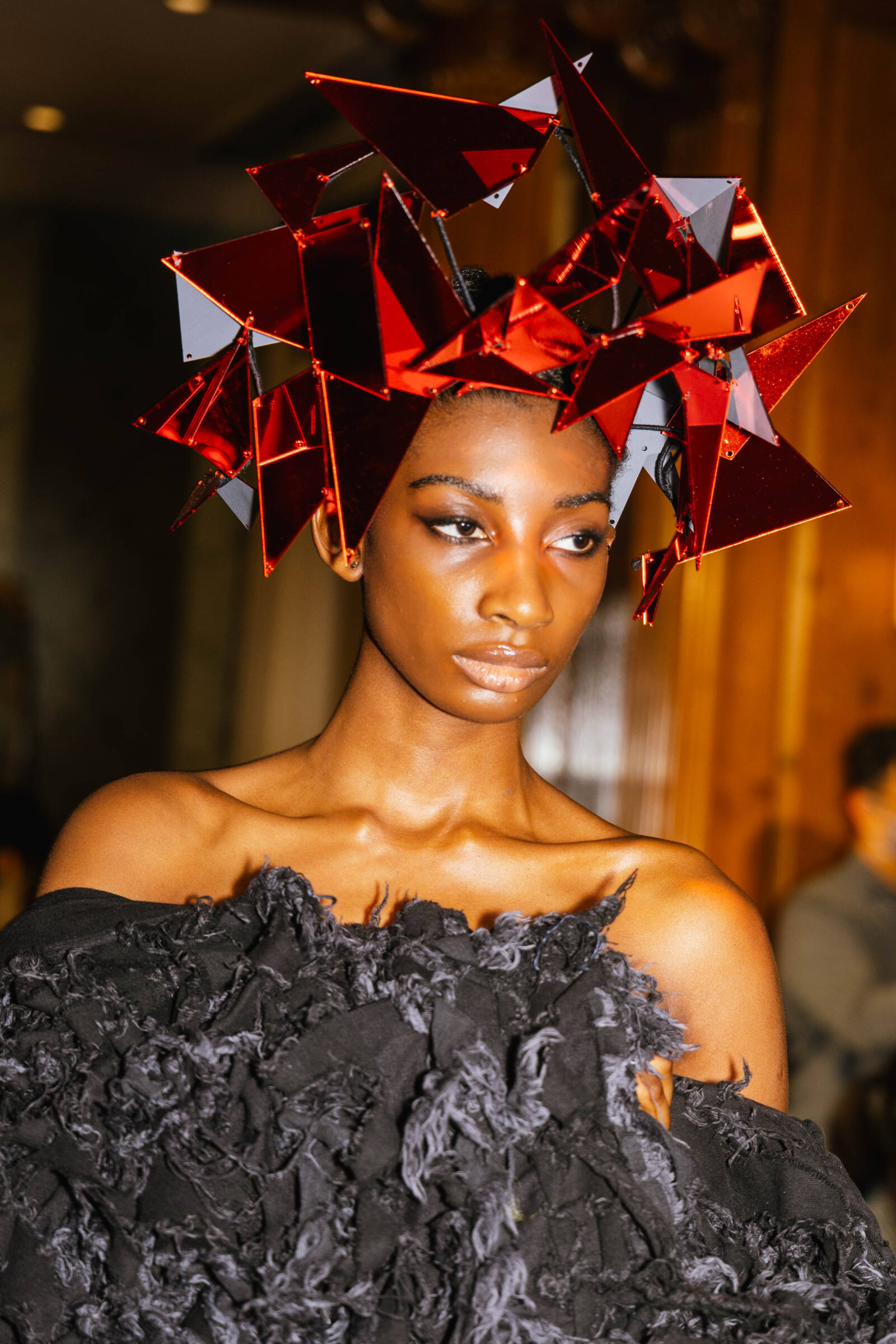 Hand craftsmanship is present from intricate closures and acrylic detailing to the introduction of accessories for the first time in the designer’s runway. All headpieces were developed by Roberta Cucuzza, some of which integrated biomaterials, adding sculptural warmth to the structural language of the collection. Sustainable denim experimentation also appears throughout, emphasising a commitment to responsible textile development.