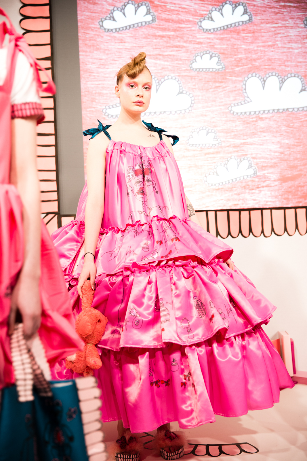 The succinct FW18 collection is inspired by dark secrets, phobias, social anxieties and traumas. The individual pieces themselves, discuss serious subjects through highest levels of self-irony. Most of the bold, colourful designs in the collection are hand knitted as a protest against fast, convenient fashion – a rebellion that we’re seeing more and more of throughout the Fashion Month model. A twist is added by portraying serious topics with cute and fuzzy materials, such as yarns from alpaca, camel, goat and sheep. Flirting with sculptural forms, bold colours, unique patterns, the collection shares provocative messages and symbols, transcending the traditional gender conformity. Bright, vibrant and definitely eye catching.